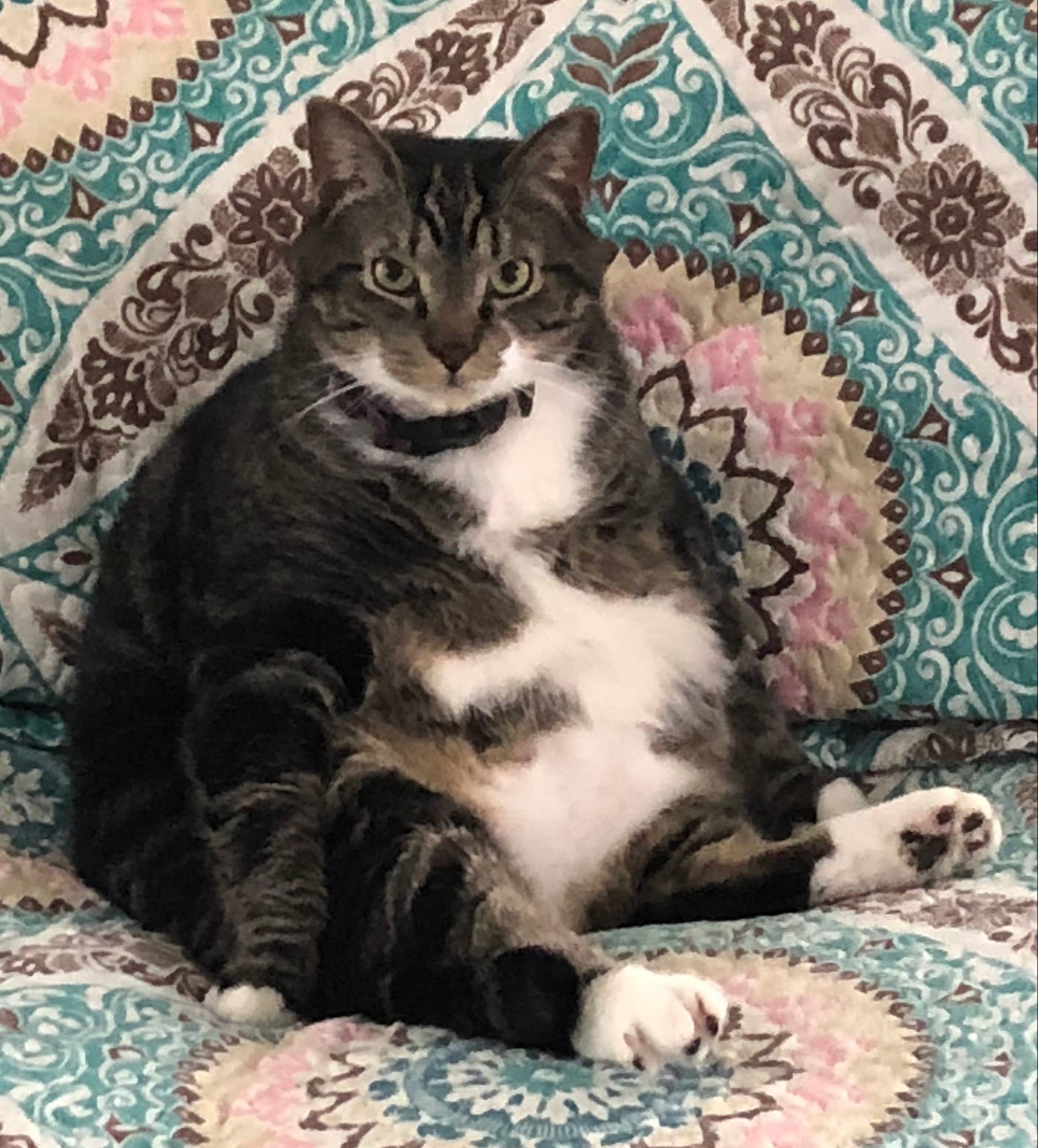 Description: Chevy is a large friendly cat with a black “M” marking on his forehead.