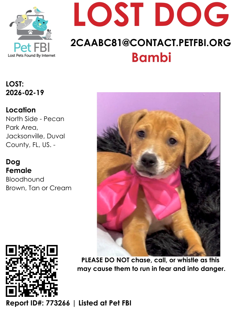 Comments: She is bigger than what she looks. Our Bambi jumped the gate Thursday. She is a red hound mix. She is very very timid and shy and will buckle down if you try to approach her. We are located on the North Side of Jax in Pecan Park. If you see her please let me know.