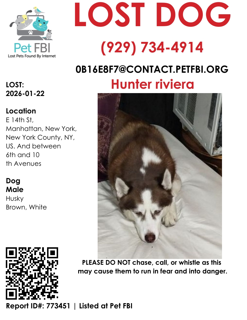 Purple collar Hunter is very friendly and will go up to anyone for back and belly scratches guy who n stole him travels with a large hikers camping backpack and an orange tent and green yoga pad his name is francis 45-50 years old goes by frank and he is homeless and has short grayish white mixed with brown /black full mustache and beard