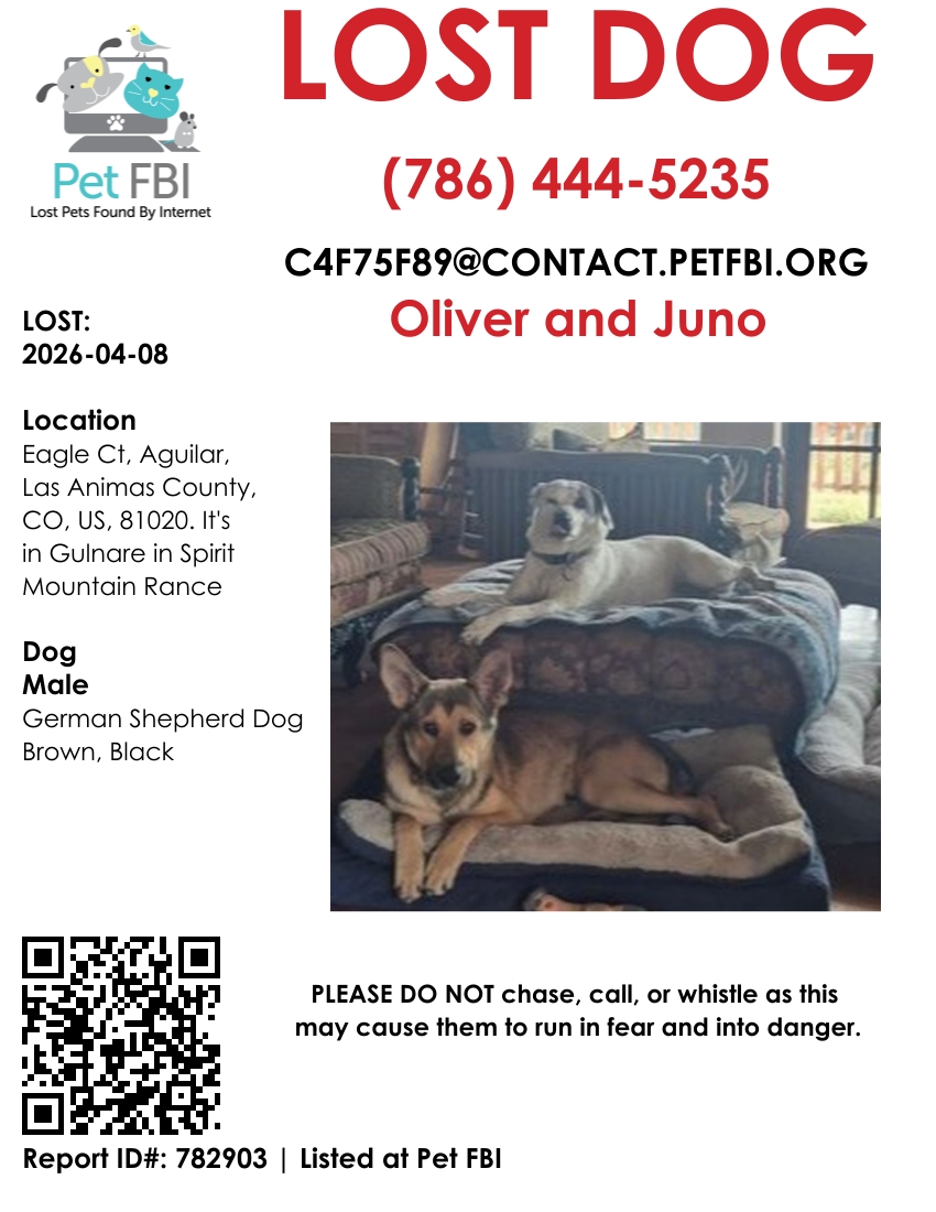 Comments: Oliver is friendly but very cautious, especially of men. He is a German Shepherd mix with a brown and black coat. Juno is a white dog with brown spots and extremely friendly.