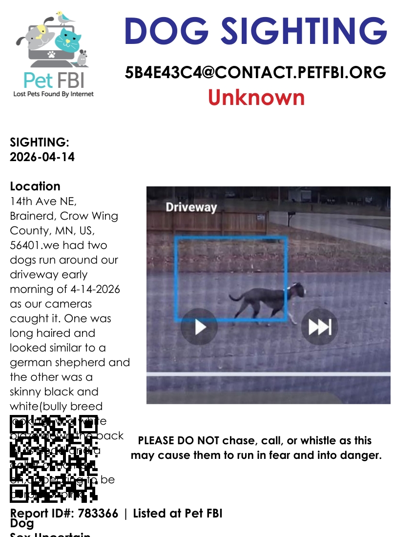 Location: 14th Ave NE, Brainerd, Crow Wing County, MN, US, 56401.we had two dogs run around our driveway early morning of 4-14-2026 as our cameras caught it. One was long haired and looked similar to a german shepherd and the other was a skinny black and white(bully breed looking) w a white blaze down the back of its head and a collar or harness on,appearing to be purple or pink.